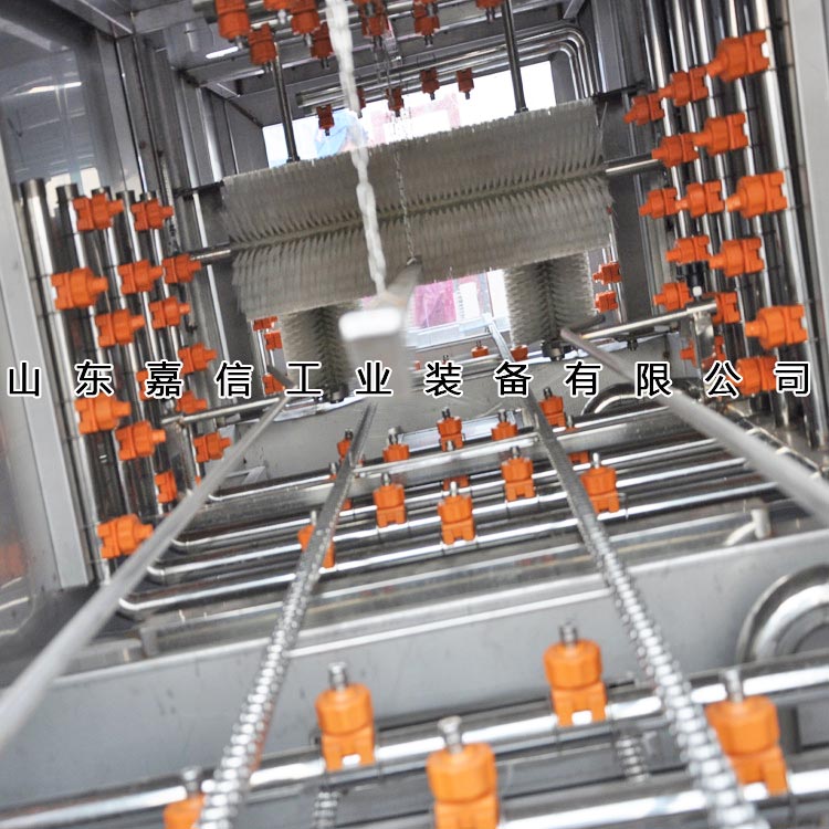 本機(jī)開啟后,由人工送料到噴淋清洗機(jī)鏈條軌道或由輸送連接自動(dòng)進(jìn)料,先堿液噴淋,然后熱水噴淋,再進(jìn)行清水循環(huán)噴淋,消毒水噴淋。四組各自獨(dú)立,外置循環(huán)水箱,過濾網(wǎng)可方便抽取。周轉(zhuǎn)箱沖洗進(jìn)出口由人工操作。