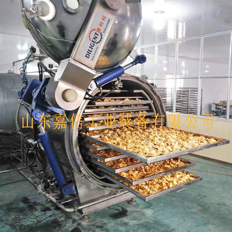 全自動果蔬脆片膨化線實現(xiàn)了果蔬加工從油炸到非油炸的飛躍,采用的果蔬壓差膨化干燥技術(shù),是一種新型、環(huán)保、節(jié)能的非油炸膨化干燥技術(shù),其基本原理是將經(jīng)過預(yù)處理的水果或蔬菜原料,在膨化罐中升溫加壓,一段時間后瞬間泄壓,物料內(nèi)部水分瞬間汽化蒸發(fā)膨脹,并在真空狀態(tài)下脫水干燥,進而實現(xiàn)體積膨脹、口感酥脆的果蔬膨化休閑食品。