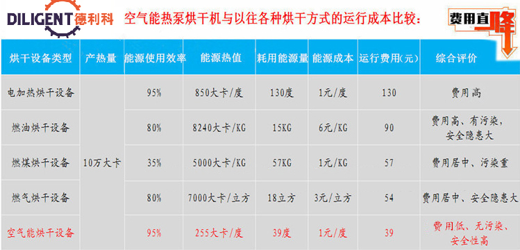 設(shè)備只需消耗少量的電能,就可以在空氣中吸收大量的熱量,耗電量僅為電加熱器的1/4;同燃煤、油、燃氣烘干機相比,可節(jié)省70%左右的運行費用。1度電等于4度電。