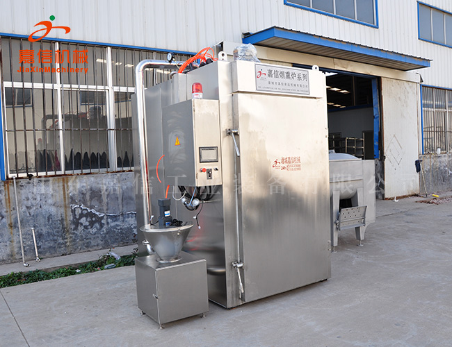 本設(shè)備由煙熏箱、自動程序控制器、煙霧發(fā)生器、煙熏車四部分組成。關(guān)鍵部件是由蒸汽管道、熱交換器和出氣通道組成完善的循環(huán)系統(tǒng),箱內(nèi)熏煙與熱氣的混合氣體在兩組循環(huán)風(fēng)機的作用下,形成渦流區(qū)域,使混合氣體以適宜的速度平衡而均勻地通過懸掛在煙熏箱內(nèi)的肉制品,使其熟化和滅菌。
