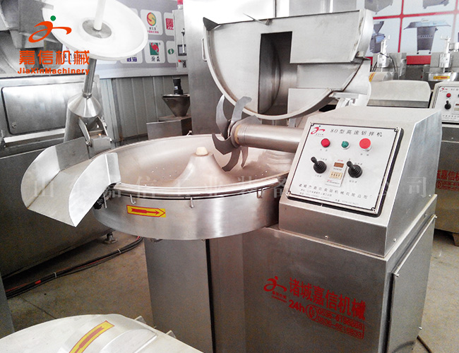 斬拌機利用斬刀高速旋轉(zhuǎn)的斬切作用,將肉塊,碎肉,脂肪等主要原料精細的斬切成肉餡或肉泥,同時將其它原料如水,冰片,輔料一起攪拌成均勻的乳狀物。斬刀高速旋轉(zhuǎn),可以縮短運行時間,減少物料發(fā)熱量,保持餡料的天然色澤、彈性、出品率和產(chǎn)品的保質(zhì)期。